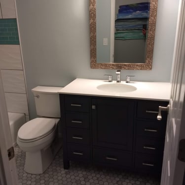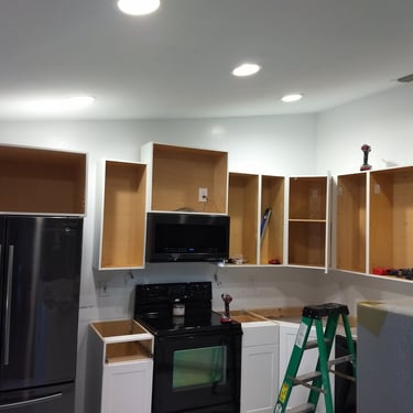 Home Depot cabinet install, tile flooring, and backsplash